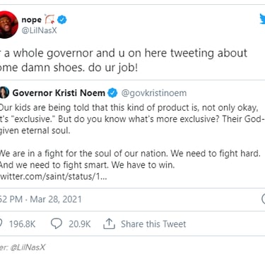 Lil Nas has pulled off, what I think, one of the better marketing efforts of the last 20 years. And in the process, he has exposed some the hypocrisy that is at the core of religious extremism. He has created a beautiful video (MONTERO - Call Me By Your Name), a thought-provoking song, and has done more good than harm to people than the Governor of South Dakota will do in a lifetime of lifetimes. Watch the video: