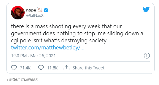 One last comment I would make about his exploiting “children” by using the popularity of his previous song (a duet with Billy Ray Cyrus) that became popular among children, Lil Nas X, himself, said it best: